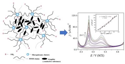 A polydimethylsiloxane amino functionalized polymer network with graphite incorporated was used as electrode material to detect copper ions in aqueous solutions and sugarcane spirit.