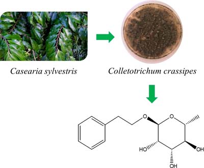 A new compound 1-phenylethyl-O-α-L-rhamnopyranoside from C. crassipes, together with sixteen secondary metabolites were isolated from two endophytic fungi associated with Casearia sylvestris. The compound cyclo(D)-Pro-(D)-Phe exhibited potent antifungal and antioxidant activity and potent acetylcholinesterase (AChE) inhibition.