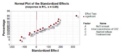 Full factorial experimental design was applied for the treatment of carbamazepine, which is one of the most used drugs for treatment of neuropathic pain. The results showed that applied voltage is the most significant factor in this treatment process. Moreover, pathway degradation was monitored as well using liquid chromatography-time of flight/mass spectrometry (LC-TOF/MS).