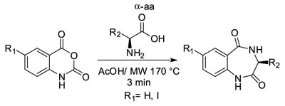 Improved method for the synthesis of benzodiazepin-2,5-diones and 7-iodobenzodiazepin-2,5-diones mediated by glacial acetic acid.