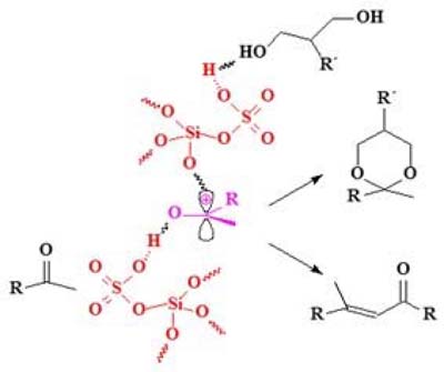 A sulfuric acid modified silica catalyst has great affinity for ketones, producing high yields of self-condensation products; in the presence of polyalcohols, ketals are easily prepared.
