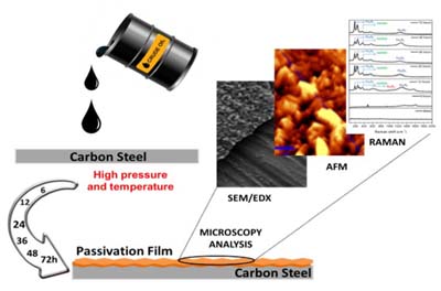 AISI 1020 steel was submitted to thermal degradation in acid crude oil. Microscopy images (light microscopy (LM), scanning electron microscopy/energy dispersive spectroscopy (SEM/EDX), atomic force microscopy (AFM), and Raman) were combined to understand the influence of corrosion rate. A passivation film was formed, which consisted of two layers (an external, formed of FeS, and an internal, composed of iron oxides).