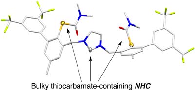 A thiocarbamate-containing imidazolium reacts with Ag2O affording the sterically hindered N-heterocyclic carbene (NHC)-silver complex.