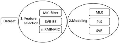 Given a dataset, first, use maximum information coefficient (MIC-filter), support vector regression backward elimination (SVR-BE) and minimal redundancy maximal relevance (mRMR-MIC) to select features. Second, use the multiple linear regression (MLR), partial least square regression (PLS) and support vector regression (SVR) to build quantitative structure activity relationship (QSAR) models.