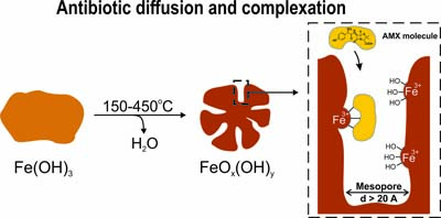 The evolution of the iron hydroxide to produce mesopores containing [FeOx(OH)y] surface sites capable of complexing the amoxicillin molecules.