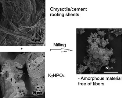 Chrysotile:cement sheets were milled with K2HPO4 and the amorphous mixture, free of fibers, presents a potential fertilizer and soil conditioner behavior.