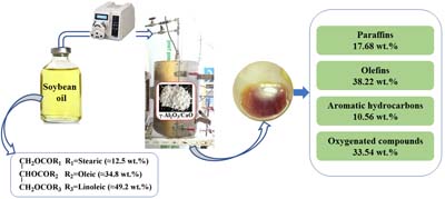 Catalytic cracking of soybean oil for biofuel over γ-Al2O3/CaO composite catalysts was conducted in a fixed-bed reactor. The biofuel showed similar chemical composition and fuel properties (low acid value and high calorific value) with the petroleum-based fuel due to the acid-base characters of γ-Al2O3/CaO composite catalysts.