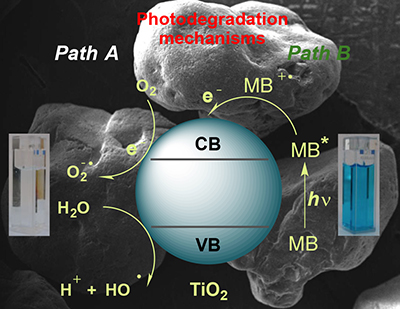 Methylene blue (MB) photooxidation over TiO2 decorated sand grains.