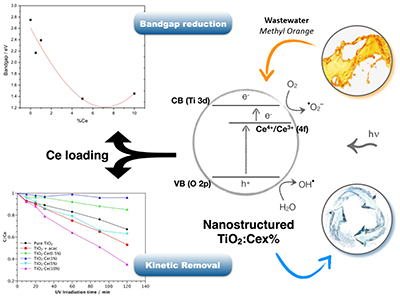 Cerium addition reduces the bandgap energy of new nanostructured TiO2:Cex% photocatalysts from ca. 3.0 to 1.45 eV. Mild photocatalysis conditions can be efficiently applied to degrade dyes.