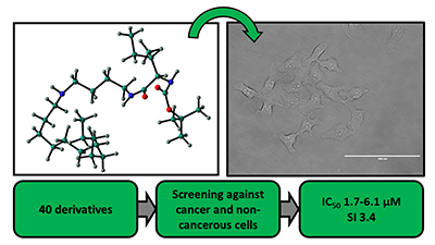 Forty amino acids derivatives were assayed towards four different cancer lines and two normal strains. Three derivatives were found with mean half-maximal inhibitory concentration (IC50) at the low micromolar range. The N-alkyl diamine associated with an amino acid scaffold showed promising results.