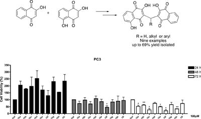 A novel method for the synthesis of nonsymmetrical 3,3'-(aryl/alkyl-methylene)bis-2-hydroxy-1,4-naphthoquinones was developed by using the Mannich adduct of naphthoquinone and the reaction with another moiety of 2-hydroxy-1,4-naphthoquinone.