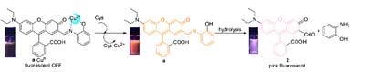 Cysteine (Cys) can release CuII ion from the non-fluorescent a-CuII complex. Then hydrolytic cleavage of Schiff base (E)-2-(6-(diethylamino)-2-((2-hydroxyphenylimino)methyl)-3-oxo-3H-xanthen-9-yl)benzoic acid (a) produces a pink fluorescent compound 2-(6-(diethylamino)-2-formyl-3-oxo-3H-xanthen-9-yl)benzoic acid (2). Thus, Cys residues act as a “switch” in an off-on fluorescence system.