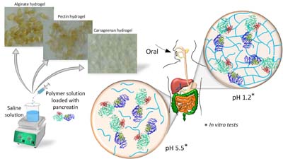 Three hydrogels were prepared and applied in pancreatin encapsulation. Alginate hydrogel presented better encapsulation efficiency and enzyme release representing as an alternative to replace the commercial formulation.