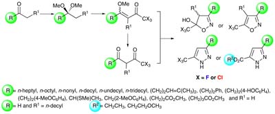 The goal is to demonstrate the scope of the practical acetal acetylation methodology for synthesis of trihalomethyl substituted 1,3-dielectrophiles and their versatility in the preparation of 1,2-azoles.
