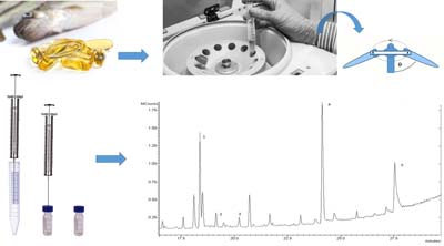 A gas chromatography-mass spectrometry (GC-MS) method was optimized to determine ω-3 and ω-6 fatty acids in supplements of fish oil; concentration values were compared to those informed by manufacturers.