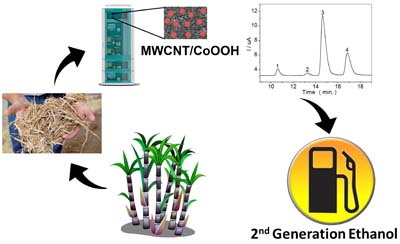 The image represents the origin of bagasse of sugarcane, extraction of carbohydrates from bagasse and carbohydrates analysis using the glassy carbon electrode modified with multi-walled carbon nanotubes containing cobalt oxide nanoparticles (GCE/MWCNT/CoOOH) electrode coupled to high-performance liquid chromatography (HPLC) with reverse pulsed amperometric detection for the production of second generation ethanol.