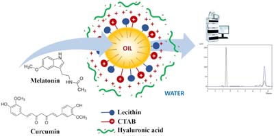 A high-performance liquid chromatography (HPLC) method was developed and validated to simultaneously determine curcumin and melatonin in hyaluronic acid-coated nanoemulsions.