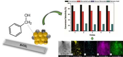 Efficient and recyclable AuPt/SrCO3 catalyst for oxidation of benzyl alcohol that maintains its physical-chemical properties after catalytic runs.