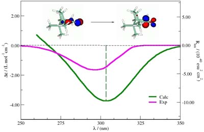 Camphor is a chiral bicyclic ketone that exhibits an exceptionally high anisotropic dissymmetry factor (g-factor). It was observed accordance between the calculated value, at time-dependent density functional theory (TD-DFT) level of theory, and the experimental result, −0.09 and −0.05, respectively. This process is associated with n → π* (highest occupied molecular orbital-lowest unoccupied molecular orbital (HOMO-LUMO)) electronic transition.