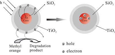 Au@SiO2/TiO2 core-shell structure particles were fabricated by ethanol reflux. The particles showed excellent photocatalysis activity for the degradation of methyl orange.