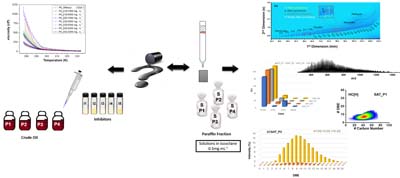 Four oils were treated with five inhibitors solutions and evaluated by rheology. These oils were fractionated by the SAP method (saturated, aromatic and polar) and the saturated fraction was analyzed by high resolution mass spectrometry (atmospheric pressure chemical ionization using a positive ionization mode (APCI(+)) Orbitrap) and two-dimensional gas chromatography coupled to quadrupole mass spectrometry (GC x GC-qMS).