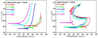 With the addition of 0.01 mol L-1 NaNO2 in pH 1 to 5 HNO3 solutions, the electrochemical behavior of X65 carbon steel transferred from the activation in the solutions free of NaNO2 to the passivation in the solutions containing NaNO2.