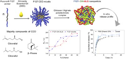 The present study reports the high encapsulation efficiency and the in vitro release study of citronella essential oil in Pluronic® F127 nanoparticles coated with chitosan-sodium alginate polyelectrolyte complex.