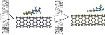 Band structure and local density of states (LDOS), around the Fermi level, for (8.0) single wall carbon nanotube (SWCNT) plus ethinylestradiol molecule and estrone molecule, in most stable configurations.