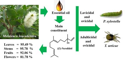 Essential oils rich in (E)-nerolidol were identified in different parts of M. leucadendra from Pernambuco, Brazil. Essential oils presented high toxicity against adults and eggs of T. urticae and P. xylostella