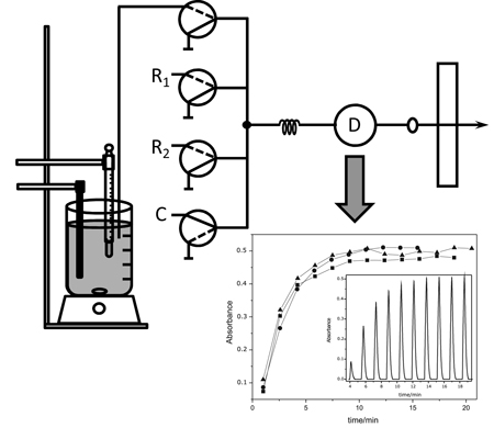 Apparatus for dissolution assays of pharmaceutical preparations exploiting a flow-system with multi-commutation. The output of the detection system shows the transient signals and the corresponding dissolution curves.