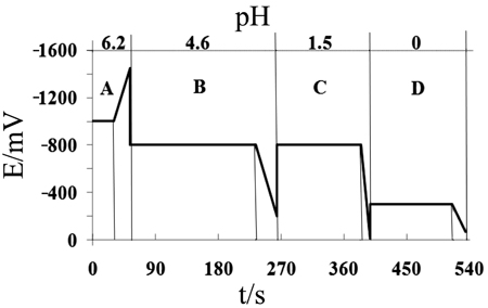 Potential and pH procedure for the sequential voltammetric determination of metallic traces in saline hemodialysis concentrates. Chromium was quantified by adsorptive cathodic stripping voltammetry. Anodic stripping voltammetry was used for Tl, Cd, Pb, Cu and Sb quantification.