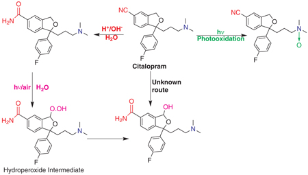 A forced degradation study on citalopram hydrobromide has revealed five degradation products.One photolytic and two hydrolytic products are characterized through LC-MS studies. A SIAM is developed and validated for quantitative analysis of citalopram.