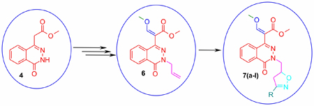 Synthesis of 3-isoxazoline substituted phthalazine-methoxyacrylate derivatives.