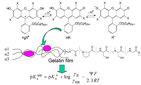 The acid-base indicator dyes were embedded into the gelatin films by extracting from aqueous media under appropriate conditions. The well-reproducible indices of the apparent ionization constants, pKaapp, of the indicators were calculated by conventional equating the pH values of the bulk aqueous buffer and those of the 'internal' water into the gelatin films.