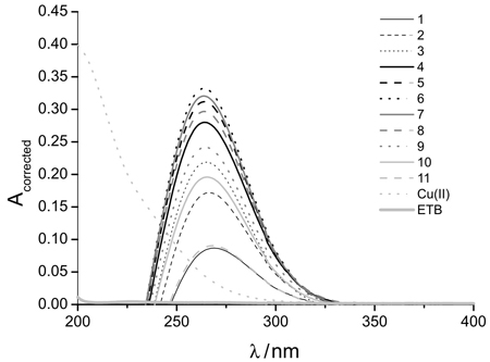 UV-Vis spectra of eleven experiments performed through a full 32 experimental design for CuETB complexation study.