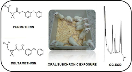 This study determined the residual levels of permethrin and deltamethrin in the liver and heart tissues of Wistar rats submitted to sub-chronic oral exposure with pyrethroids, as well as the effect of ingesting fibers on the residual levels of the pyrethroids by using GC-ECD analysis.