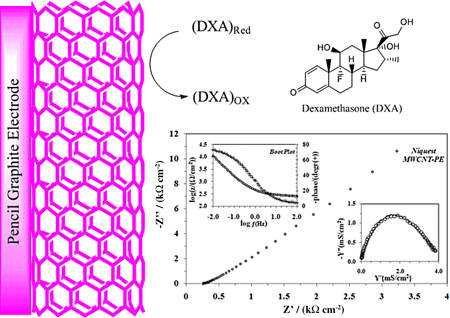 Dexamethasone as steroid hormone do not have electrooxidation on pencil graphite electrode but with using of multiwalled carbon nanotubes it shows the electrooxidation behavior.