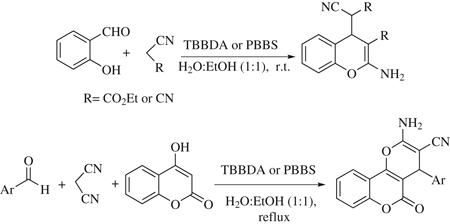 Poly(N,N'-dibromo-N-ethyl-benzene- 1,3-disulfonamide) [PBBS] and N,N,N',N'-tetrabromo-benzene-1,3-disulfonamide [TBBDA ] are reusable and efficient catalysts for the synthesis of 4H-chromenes and dihydropyrano[3,2-c]chromenes.