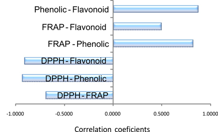 Correlation coefficients between the DPPH· and FRAP methods, and contents of phenolic compounds and flavonoids of propolis ethanolic extracts obtained with different concentrations of propolis and ethanol contents.