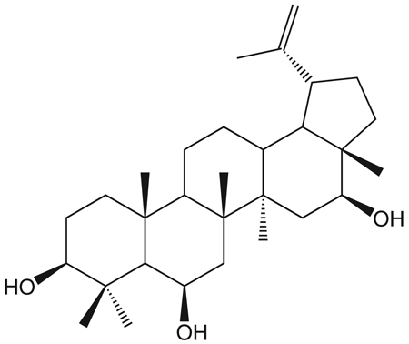 Structure of a natural triterpene, 3 b,6 b,16b-triidroxilup-20(29)-eno, isolated from Combretum leprosum fruits which has leishmanicidal activity against Leishmania amazonensis promastigotes.