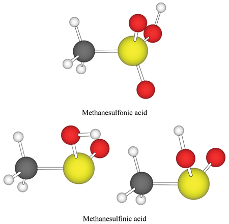 Graphical representations of methanesulfonic acid and the two conformers of methanesulfinic acid, whose spectroscopic and thermochemical properties were obtained from high level ab initio calculations.
