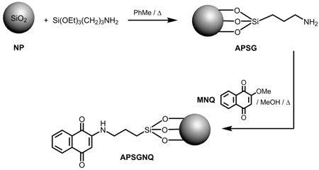 Our work has demonstrated that the reaction of aminopropylsilicalgel NPs with labile 2-methoxy-1,4-naphthoquinones is a good route to silica NPs containing bound amino-naphthoquinones.