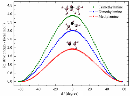 TPotential energy curves along the Internal Reaction Coordinate path for the rotation motion of methylamine, dimethylamine and trimethylamine molecules.