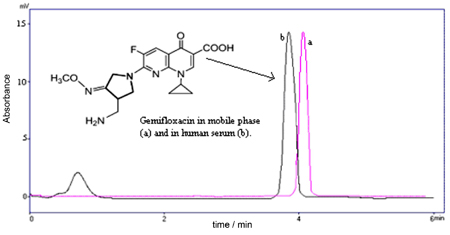 Graphical abstract represents the chromatogram of gemifloxacin (GMFX) at a concentration level of 25 ìg mL-1 in mobile phase (a) composed of methanol:water (90:10, v/v) and human serum (b) at 270 nm, obtained by applying the proposed method.