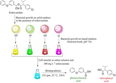 The biodegradation of the pyrethroid pesticide esfenvalerate by a bacterial consortium (90% biodegradation) and the major obtained metabolites.