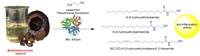Synthesis of fatty acid amides from the oil of Bertholletia excelsa, using Amano lipase from Pseudomonas fluorescens, demonstrated anti-inflammatory activity.