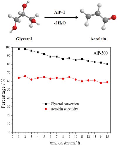 Aluminum phosphate (AlP) catalysts prepared by a simple replacement reaction method exhibited excellent catalytic performance for glycerol dehydration. AlP-500 showed highest acrolein selectivity of 66% at 98% glycerol conversion. The acidity of AlP-T played an important role in the glycerol dehydration reaction.