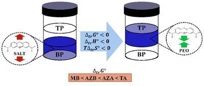 All phenothiazine dyes concentrate, predominantly, in the polymer enriched phase, due to the dye-poly(ethylene oxide) (PEO) attractive interactions that occur mainly via benzene condensed ring present in the structures of dyes, which made the partitioning process enthalpically driven.