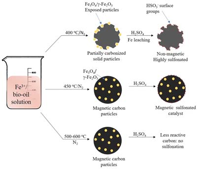 Bio-oil was used to dispersed Fe3+, which upon thermal treatment (400-600 °C) and sulfonation produced a magnetic acid catalyst for esterification reactions.