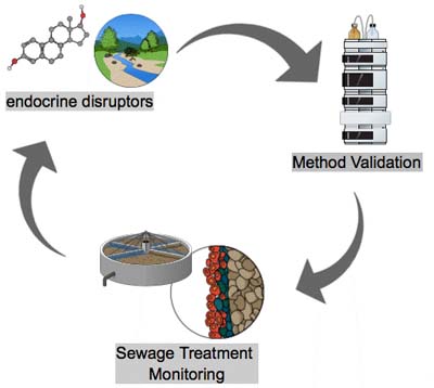 Solid phase extraction followed by high-performance liquid chromatography with diode array detection (SPE-HPLC-DAD) method was validated and applied to endocrine disruptors environmental monitoring detection; hormones, pharmaceuticals and plastic compounds were found in high concentration in sewage treatment plants in Ceará, Brazil; biological treatments showed some efficiency in removal of endocrine disruptors compounds, although a post-treatment step is necessary.